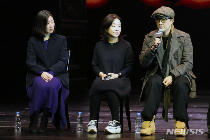[서울=뉴시스] 박진희 기자 = 뮤지컬 '베토벤' 제작진이 19일 서울 서초구 예술의전당 오페라극장에서 언론 시연을 마치고 기자간담회를 하고 있다. 왼쪽부터 대본 슈퍼바이저 이단비, 음악감독 김문정, 안무감독 문성우. 2023.01.19. [email protected]