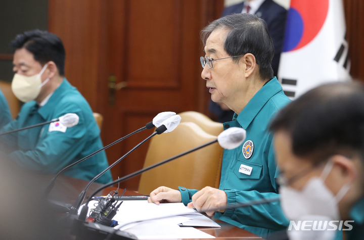 [서울=뉴시스] 김명원 기자 = 한덕수 국무총리가 20일 오전 서울 종로구 정부서울청사에서 열린 코로나19 중앙재난안전대책본부(중대본) 회의에 참석해 발언하고 있다. 이날 한덕수 총리는 실내마스크 착용 의무를 1단계 완화 시점으로 설 연휴 이후 30일부터 해제하는 등 부분 해제하는 시점과 범위를 확정해 발표했다. 2023.01.20. [email protected]