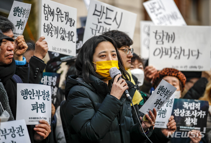 [서울=뉴시스] 정병혁 기자 = 류호정 정의당 의원이 6일 오후 서울 중구 서울광장에 설치된 분향소 앞에서 열린 서울시의 분향소 행정대집행 관련 규탄 기자회견에서 발언하고 있다. 2023.02.06. [email protected]
