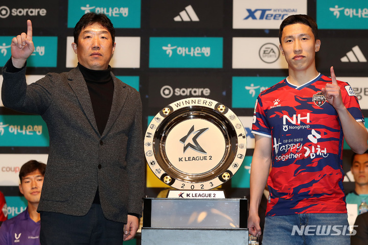 [서울=뉴시스] 백동현 기자 = 21일 오후 서울 서초구 더케이호텔서울에서 열린 2023시즌 K리그2 미디어데이에서 성한수(왼쪽) 김천상무 감독과 이영재 선수가 기념촬영하고 있다. 2023.02.21. [email protected]