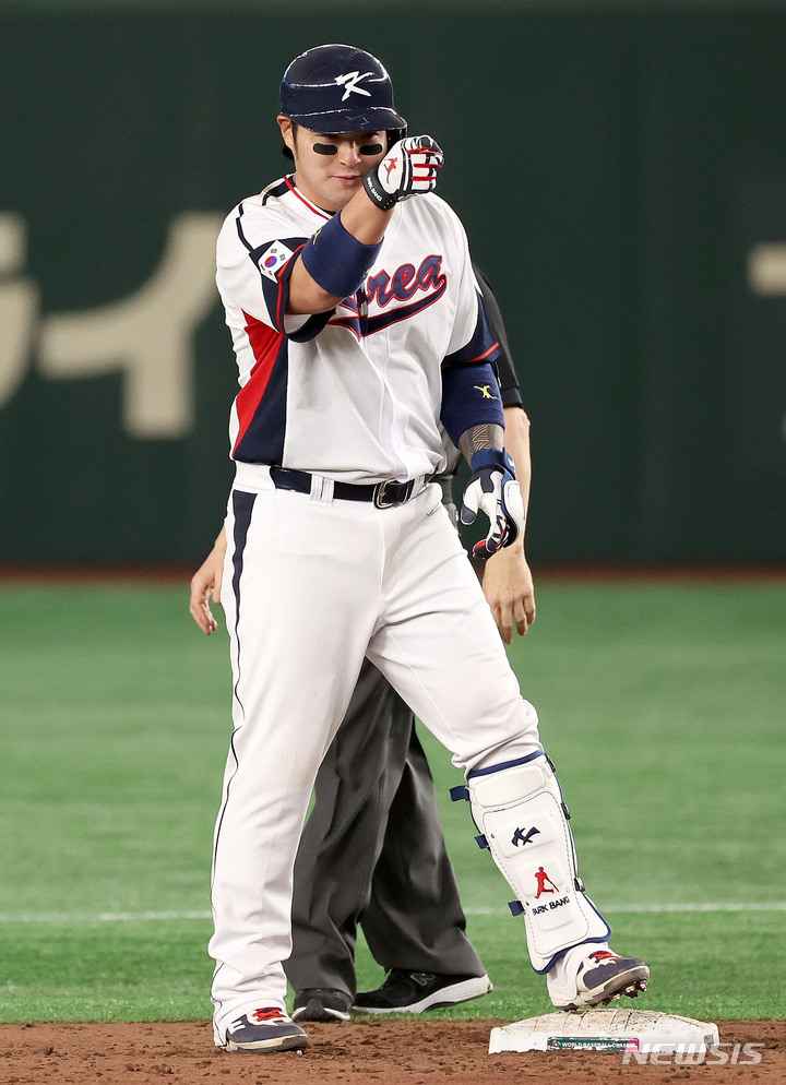[도쿄=뉴시스] 김선웅 기자 = 9일 일본 도쿄돔에서 열린 월드베이스볼클래식(WBC) 2023 B조 호주와 대한민국의 경기, 6회말 2사 주자 1루 상황 박병호가 1타점 적시타를 날린 후 기뻐하고 있다. 2023.03.09. [email protected]