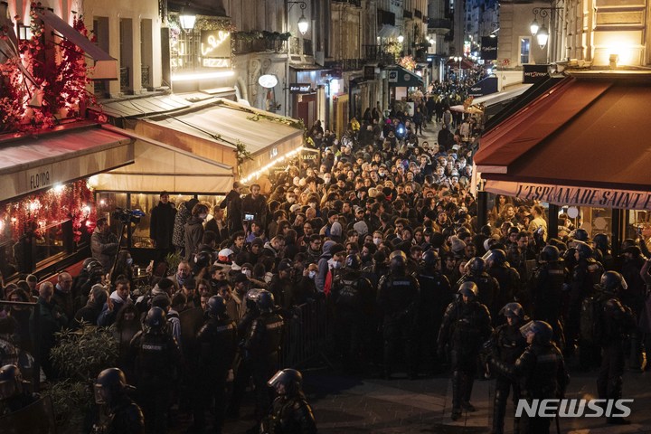 [파리=AP/뉴시스] 19일(현지시간) 프랑스 파리에서 시위 진압 경찰이 연금 개혁 반대 시위대를 막아서고 있다. 지난 16일 에마뉘엘 마크롱 정부가 연금 개혁 법안을 하원 표결 없이 입법하는 헌법 제49조 3항을 전격 발동하면서 격렬한 반대 시위가 프랑스 전역에서 이어지고 있다. 2023.03.20.