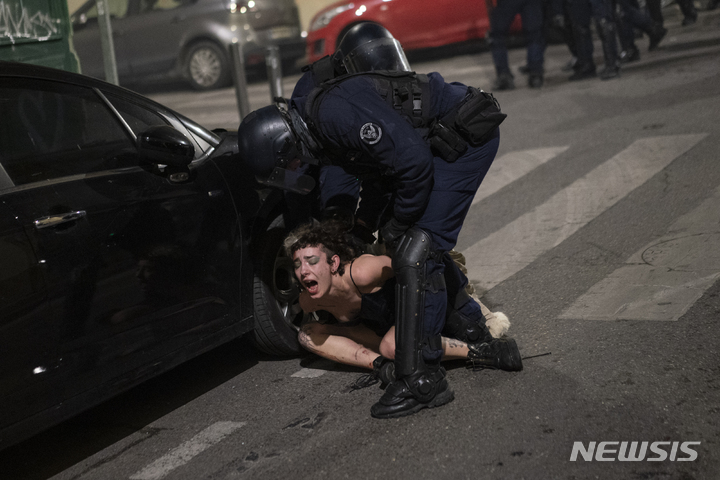 [마르세유=AP/뉴시스] 19일(현지시간) 프랑스 남부 마르세유에서 경찰이 카니발 인파를 해산시키면서 한 여성을 체포하고 있다. 지난 16일 에마뉘엘 마크롱 정부가 연금 개혁 법안을 하원 표결 없이 입법하는 헌법 제49조 3항을 전격 발동하면서 격렬한 반대 시위가 프랑스 전역에서 이어지고 있다. 2023.03.20.