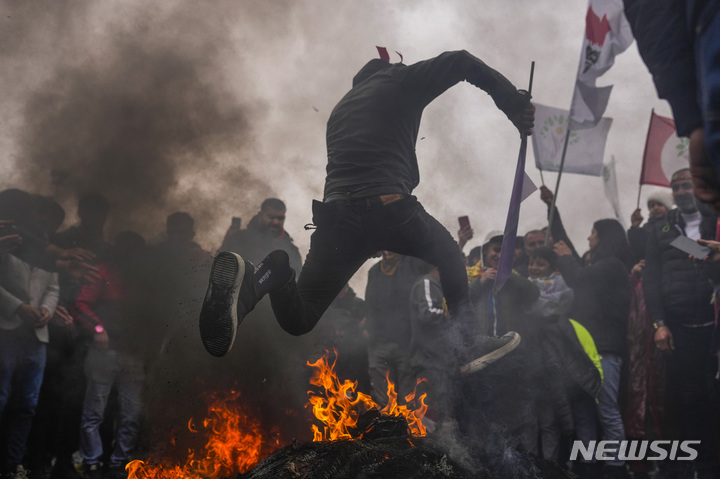 [이스탄불=AP/뉴시스] 19일(현지시간) 튀르키예 이스탄불에서 봄의 시작을 알리는 누루즈(Newroz ) 축제 중 한 청년이 모닥불을 뛰어넘고 있다. 튀르키예에서는 누루즈 축제가 열리는 동안 쿠르드족의 민족 정체성과 권리를 요구하는 쿠르드 독립 시위가 열린다. 2023.03.20.