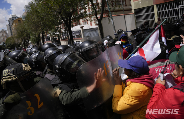 [라파스=AP/뉴시스] 20일(현지시간) 볼리비아 라파스에서 교육부로 향하는 교사 시위대가 이들을 막는 경찰과 충돌하고 있다. 교사들은 더 높은 임금을 요구하고 공립학교의 새 교과과정에 반대하며 시위를 이어가고 있다. 2023.03.21.