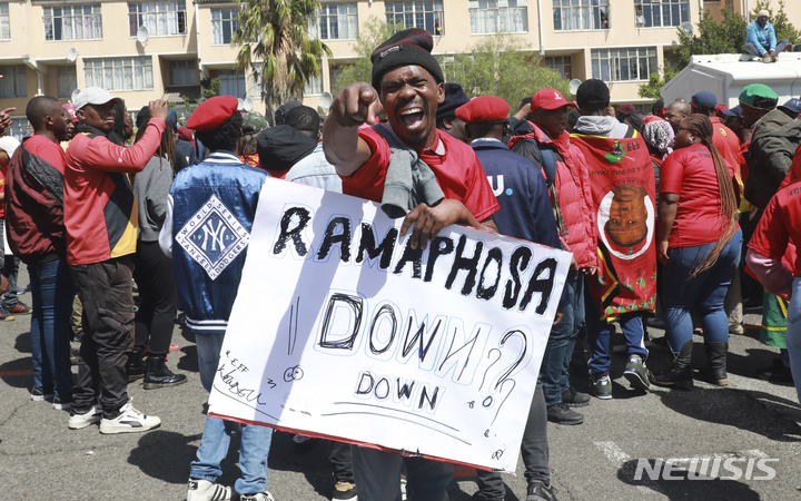 [케이프타운=AP/뉴시스] 20일(현지시간) 남아프리카공화국 케이프타운에서 경제자유투사당(EFF)의 한 지지자가 시릴 라마포사 대통령의 사임을 요구하는 손팻말을 들고 구호를 외치고 있다. 시위대는 행정수도 프리토리아를 비롯해 요하네스버그, 더반 등 주요 도시에서 만성적인 전력난 등에 항의하며 대통령 퇴진 요구 시위를 벌였다. 2023.03.21.