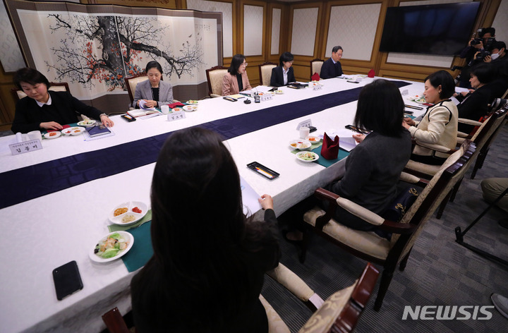 [서울=뉴시스] 배훈식 기자 = 김현숙 여성가족부 장관이 21일 오후 서울 종로구 정부서울청사에서 행복동행 여성 임원 초청 간담회를 하고 있다. 2023.03.21. [email protected]