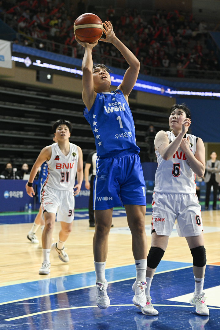 [서울=뉴시스] 고승민 기자 = 21일 아산이순신체육관에서 열린 2022-2023 여자프로농구 챔피언결정전 2차전 우리은행 대 BNK썸 경기, 우리은행 김단비가 골밑슛을 하고 있다. (사진=WKBL 제공) 2023.03.21. [email protected] *재판매 및 DB 금지