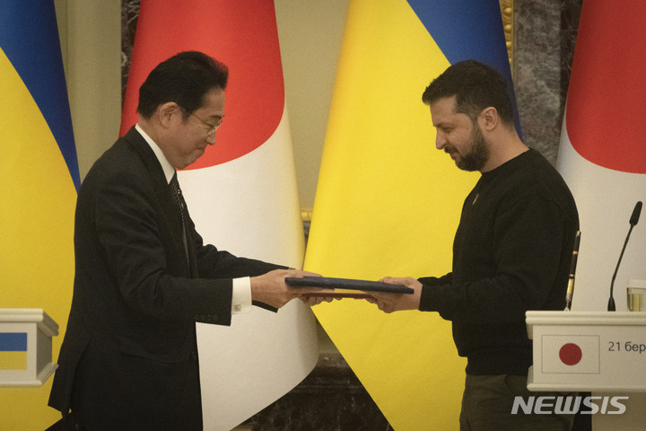 [키이우=AP/뉴시스] 우크라이나를 방문한 기시다 후미오(왼쪽) 일본 총리가 21일(현지시간) 키이우에서 볼로디미르 젤렌스키 우크라이나 대통령과 공동 기자회견 후 문서를 교환하고 있다. 기시다 총리는 "일본은 우크라이나의 평화가 회복될 때까지 지원할 것"이라고 말했다. 2023.03.22.