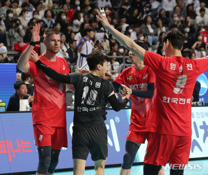 [서울=뉴시스] 조수정 기자 = 22일 오후 서울 장충체육관에서 열린 프로배구 도드람 2022-2023 V리그 남자부 준플레이오프 우리카드와 한국전력의 경기, 한국전력 선수들이 득점 후 환호하고 있다. 한국전력은 우리카드를 3-1(25-19 25-18 18-25 25-22)로 승리, 24일 천안유관순체육관에서 리그2위 현대캐피탈과 플레이오프(3전2선승제) 1차전 원정경기를 치른다. [email protected]