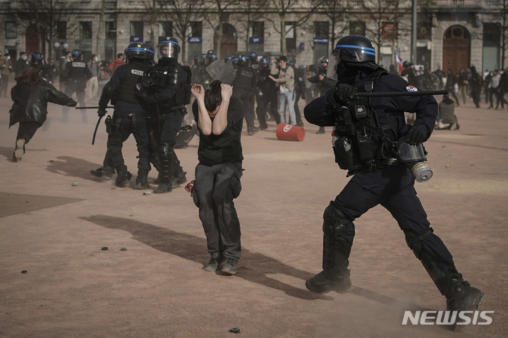 [리옹=AP/뉴시스] 23일(현지시간) 프랑스 리옹에서 연금 개혁 반대 시위대와 경찰이 충돌하고 있다. 헌법 조항을 이용해 하원을 건너뛴 정부의 연금 개혁 강행 처리로 파리를 비롯한 프랑스 전역에서 또다시 대규모 시위가 열렸다. 2023.03.24.