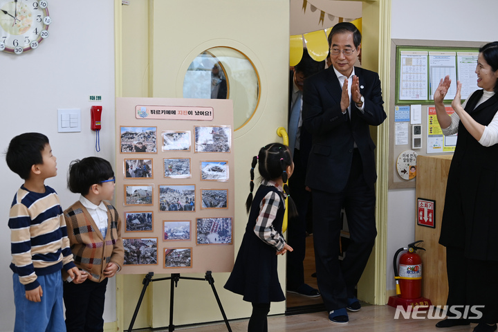 [서울=뉴시스] 배훈식 기자 = 한덕수 국무총리가 24일 오전 서울 구로구 구로삼성어린이집을 찾아 수업을 참관하고 있다.(공동취재사진) 2023.03.24. [email protected]