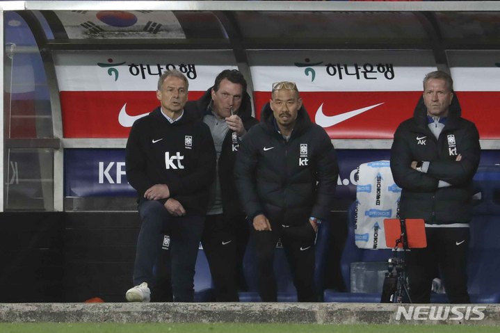 [울산=뉴시스] 김근수 기자 = 24일 오후 울산 남구 문수축구경기장에서 열린 하나은행 초청 축구 국가대표 평가전 대한민국과 콜롬비아의 경기, 위르겐 클린스만 감독이 코치진과 대회를 하고 있다. 2023.03.24. [email protected]