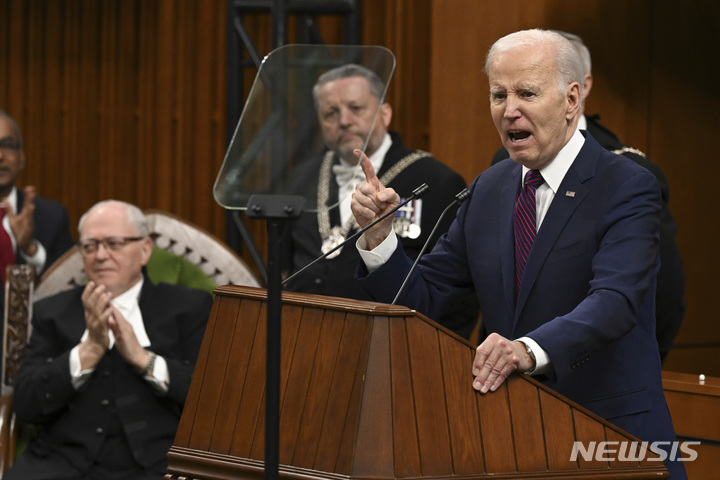 [오타와=AP/뉴시스] 조 바이든 미국 대통령이 24일(현지시간) 캐나다 의회에서 연설하고 있다. 바이든 대통령은 "캐나다와 미국이 여전히 함께 있다는 것을 아는 것보다 미래에 대해 더 큰 확신을 주는 것은 없다"라고 말하며 양국 간 동맹을 과시했다. 2023.03.25.