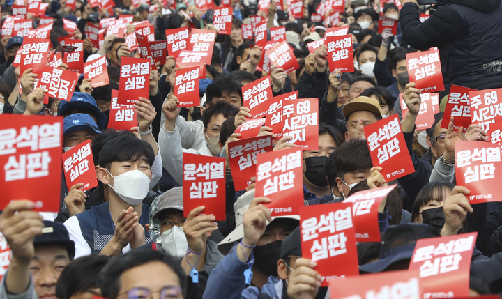[서울=뉴시스] 최진석 기자 = 민주노총 조합원들이 25일 서울 종로구 대학로에서 열린 문제는 윤석열이다. 민생파탄! 검찰독재! 윤석열 심판! 민주노총 투쟁선포대회에서 정권규탄 구호를 외치고 있다.  2023.03.25. [email protected]