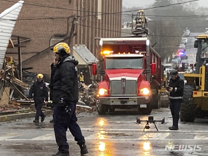 [웨스트리딩=AP/뉴시스] 25일(현지시간) 미국 펜실베이니아주 웨스트리딩에 있는 초콜렛 공장이 폭발해 5명이 사망하고 6명이 실종됐다. 사진은 긴급 구조대원들이 현장에서 작업 중인 모습. 2023.03.26
