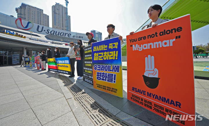 [광주=뉴시스] 이영주 기자 = 미얀마광주연대 등 광주 시민 단체들이 미얀마 국군의날을 하루 앞둔 26일 오후 광주 서구 유·스퀘어 광주종합버스터미널에서 집회를 열어 미얀마 군부의 자국민 탄압·러시아의 우크라이나 침략에 대한 중단을 촉구하고 있다. 2023.03.26. [email protected]
