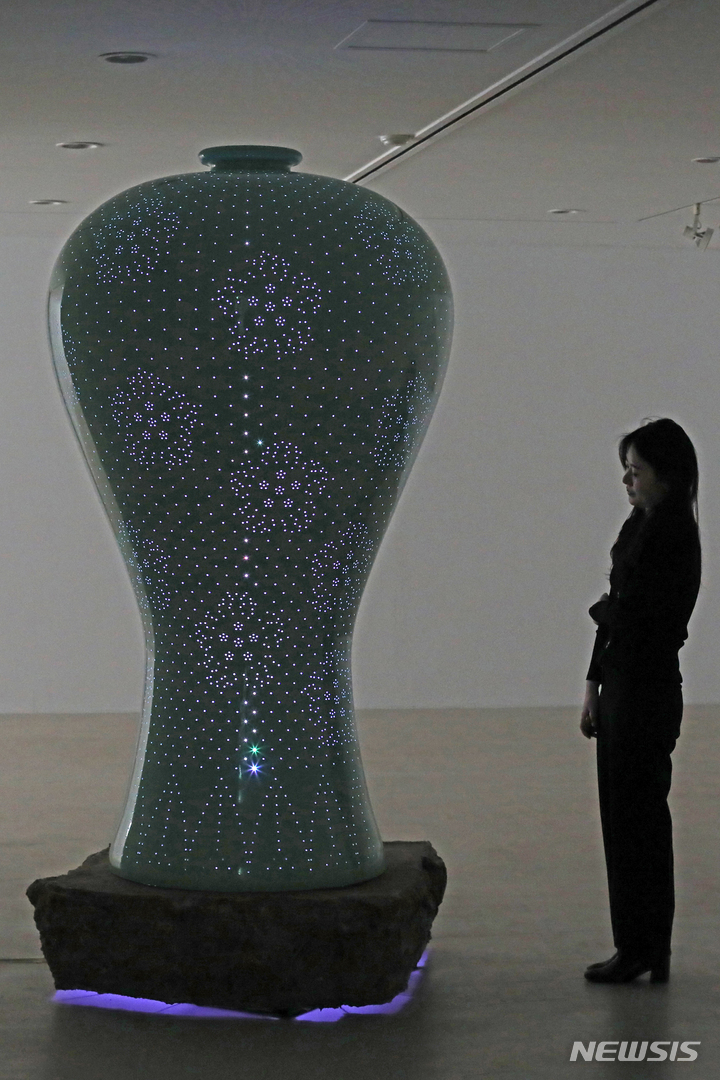 [서울=뉴시스] 박진희 기자 = 환경과 인간의 문제를 탐구해온 설치미술가 심영철(수원대 교수) 작가가 27일 서울 종로구 선화랑에서 개인전 'Dancing Garden' 전시 개막을 앞두고 자연과 환경에서 영감을 받아 작업한 작품 '빛의 도자기'를 선보이고 있다. 2023.03.27. [email protected]
