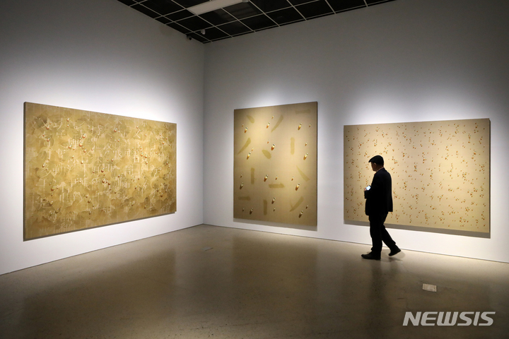 [청주=뉴시스] 박진희 기자 = 국립현대미술관(MMCA)은 미술관의 전시를 소개하는 주제 기획전 '전시의 전시' 개막을 앞둔 28일 충북 청주시 국립현대미술관 청주에서 언론 공개 행사를 갖고 주요 작품을 소개하고 있다. 이번 기획전은 국립현대미술관의 지난 전시 중 ‘기념’을 위해 개최되었던 4개 전시를 재해석한 메타 전시이다. 전시는 내일부터 7월 30일까지 국립현대미술관 청주 미술품수장센터에서 개최한다. 사진 속 작품은 김창열 작가의 '물방물'. 2023.03.28. [email protected]