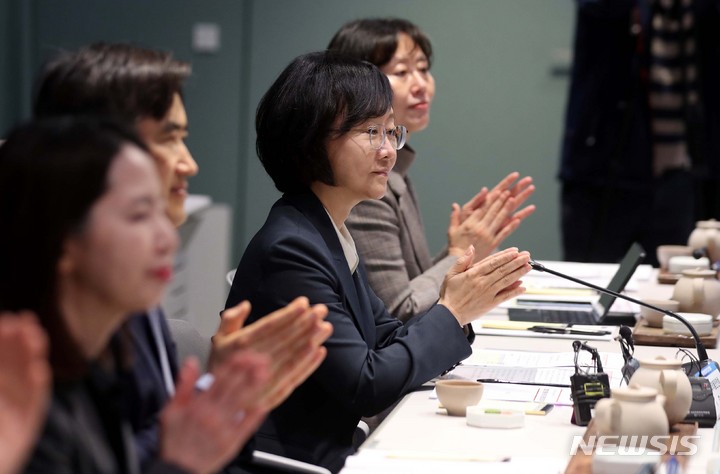 [서울=뉴시스] 조성봉 기자 = 오유경 식품의약품안전처장이 28일 오후 서울 용산구 아모레퍼시픽 본사에서 열린 화장품 업계 CEO 간담회에서 박수를 치고 있다. 2023.03.28. [email protected]