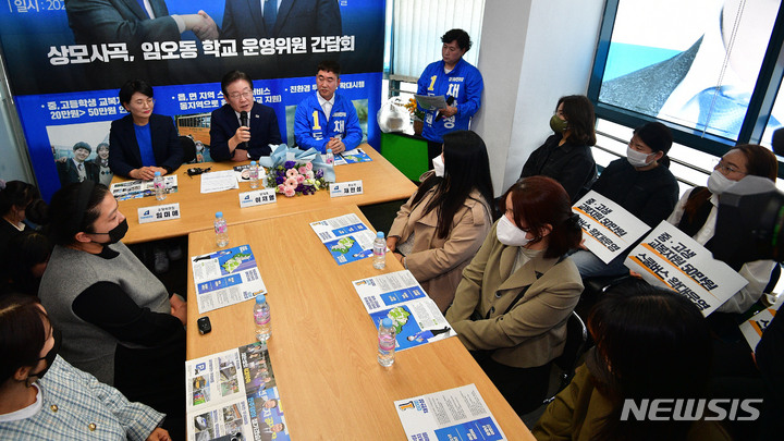 [구미=뉴시스] 이무열 기자 = 이재명 더불어민주당 대표가 28일 오후 경북 구미시 채한성 후보 선거사무소에서 열린 상모사곡동·임오동 학교운영위원 간담회에 참석해 학부모들과 대화하고 있다. 2023.03.28. [email protected]