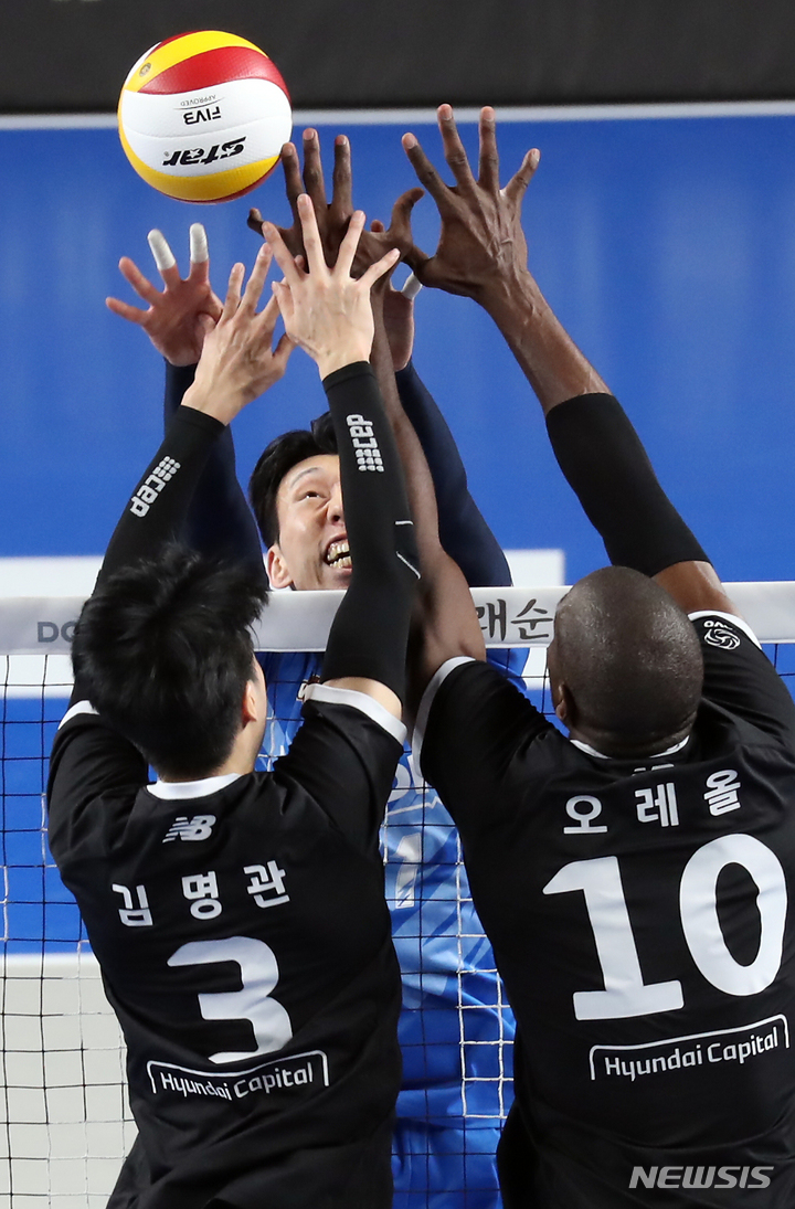 [천안=뉴시스] 강종민 기자 = 28일 충남 천안유관순체육관에서 열린 '2022-23시즌 도드람 V-리그' 남자부 플레이오프(PO) 3차전 현대캐피탈과 한국전력 경기에서 양팀 선수들이 네트 위에서 볼다툼을 벌이고 있다. 2023.03.28. [email protected]