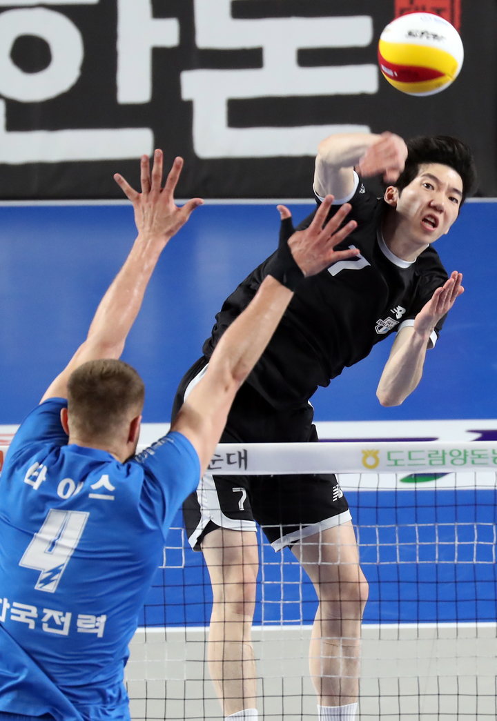 [천안=뉴시스] 강종민 기자 = 28일 충남 천안유관순체육관에서 열린 '2022-23시즌 도드람 V-리그' 남자부 플레이오프(PO) 3차전 현대캐피탈과 한국전력 경기에서 현대캐피탈 허수봉이 강스파이크를 때리고 있다. 2023.03.28. [email protected]