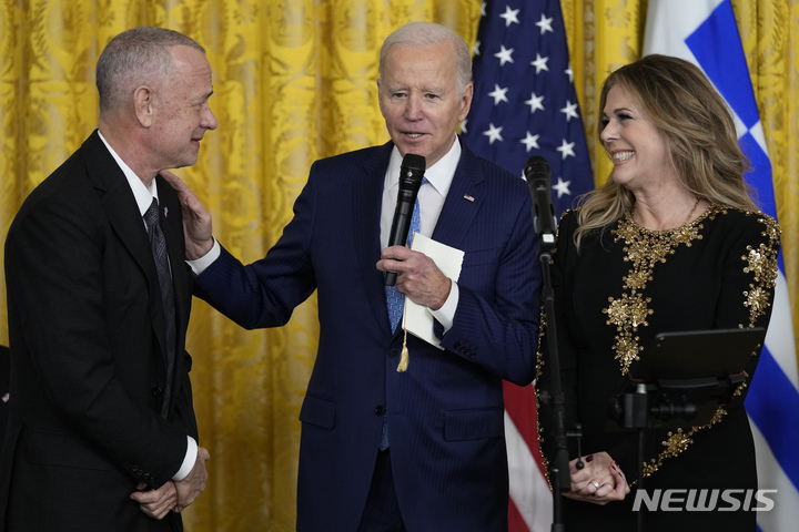 [워싱턴=AP/뉴시스] 조 바이든(가운데) 미국 대통령이 29일(현지시간) 백악관 이스트룸에서 열린 그리스 독립기념일 축하 리셉션에서 배우 톰 행크스(왼쪽)와 그의 부인이자 가수인 리타 윌슨을 소개하고 있다. 2023.03.30.