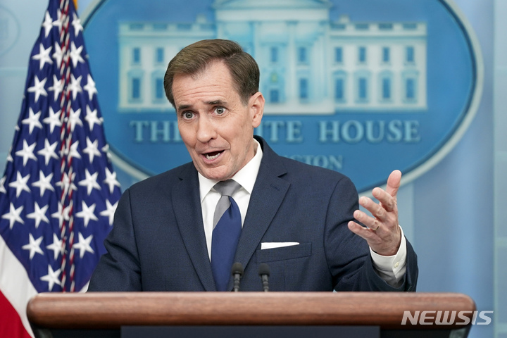 [워싱턴=AP/뉴시스] 존 커비 백악관 국가안보회의(NSC) 전략소통조정관이 29일(현지시간) 백악관에서 언론 브리핑을 하고 있다. 커비 조정관은 "차이잉원 대만 총통의 미국 방문은 관례적인 미국 경유의 일환"이라며 "중국은 이를 구실로 대만해협 주변에서 공격적인 활동을 강화하지 말라"라고 촉구했다. 2023.03.30.
