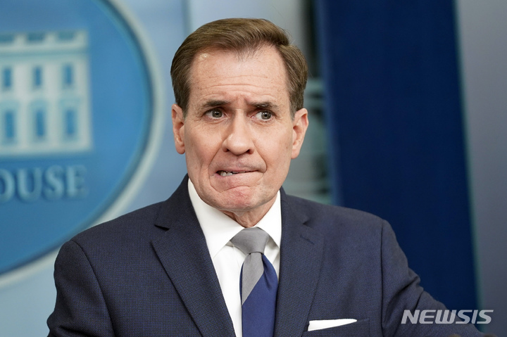 [워싱턴=AP/뉴시스] 존 커비 백악관 국가안보회의(NSC) 전략소통조정관이 29일(현지시간) 백악관에서 언론 브리핑을 하고 있다. 커비 조정관은 "차이잉원 대만 총통의 미국 방문은 관례적인 미국 경유의 일환"이라며 "중국은 이를 구실로 대만해협 주변에서 공격적인 활동을 강화하지 말라"라고 촉구했다. 2023.03.30.