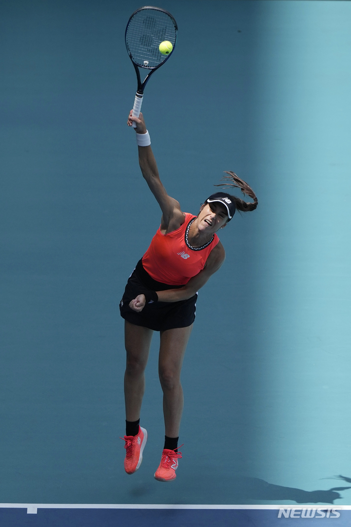 [마이애미=AP/뉴시스] 소라나 크르스테아(74위·루마니아)가 29일(현지시간) 미 플로리다주 마이애미 가든스에서 열린 여자프로테니스(WTA) 투어 마이애미오픈 단식 8강전에서 아리아나 사발렌카(2위·벨라루스)와 경기하고 있다. 크르스테아는 사발렌카를 2-0(6-4 6-4)으로 완파하고 준결승에 올랐다. 2023.03.30.