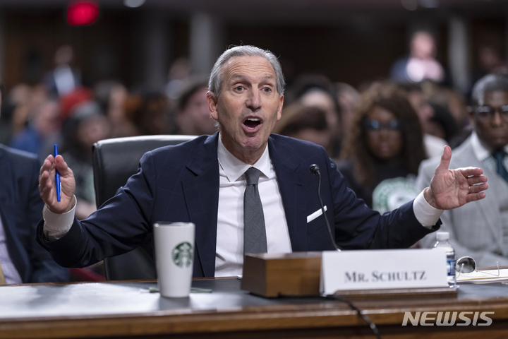 [워싱턴=AP/뉴시스] 하워드 슐츠 스타벅스 창업자가 29일(현지시간) 의사당에서 열린 미 상원 보건·교육·노동·연금 위원회의 청문회에 출석해 증언하고 있다. 노동조합 탄압 의혹에 휩싸인 슐츠 창업자는 "스타벅스는 이미 근로자들에게 업계 최고의 임금과 대우를 제공하고 있다"라며 스타벅스의 노동법 위반 의혹을 부인했다. 2023.03.30.