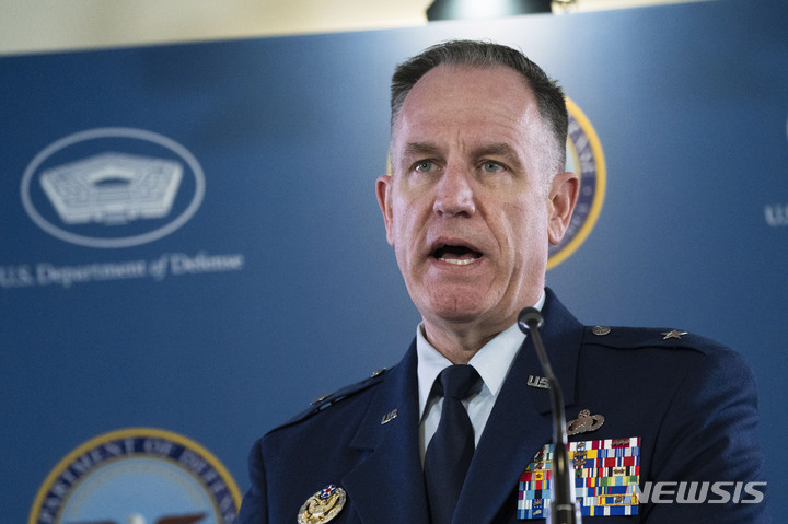 [워싱턴=AP/뉴시스] 패트릭 라이더 미 국방부 대변인이 30일(현지시간) 워싱턴 국방부 청사에서 언론 브리핑을 하고 있다. 라이더 대변인은 최근 한 상원의원이 한국에 전술 핵무기 재배치 검토를 언급한 것과 관련해 "우리의 현재 정책은 한반도 비핵화"라며 "우리의 정책을 지속해서 유지할 것"이라고 말했다. 2023.03.31.