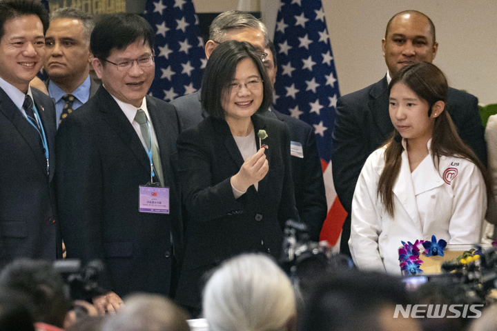 [뉴욕=AP/뉴시스] 차이잉원(가운데) 대만 총통이 30일(현지시간) 미국 뉴욕에 있는 대만경제문화사무소에서 열린 행사에 참석해 연설하고 있다. 차이 총통은 "대만은 민주주의의 최전선에 있고, 대만 국민이 단결할수록 대만은 물론 세계가 더 안전해질 것"이라고 말했다. 2023.03.31.