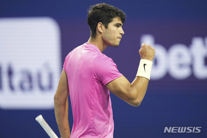 [마이애미=AP/뉴시스] 카를로스 알카라스(1위·스페인)가 30일(현지시간) 미 플로리다주 마이애미 가든스에서 열린 남자프로테니스(ATP) 투어 마이애미오픈 단식 8강전 테일러 프리츠(10위·미국)와 경기하고 있다. 알카라스가 2-0(6-4 6-2)으로 승리하고 4강에 올랐다. 2023.03.31.