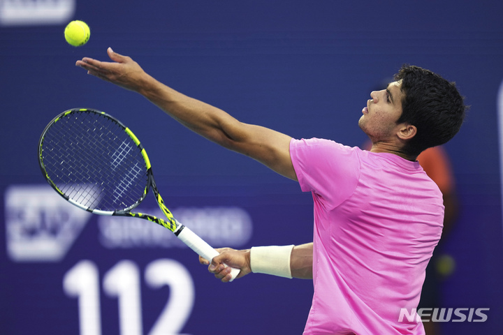 [마이애미=AP/뉴시스] 카를로스 알카라스(1위·스페인)가 30일(현지시간) 미 플로리다주 마이애미 가든스에서 열린 남자프로테니스(ATP) 투어 마이애미오픈 단식 8강전 테일러 프리츠(10위·미국)와 경기하고 있다. 알카라스가 2-0(6-4 6-2)으로 승리하고 4강에 올랐다. 2023.03.31.