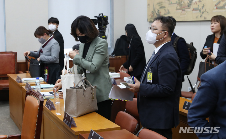 [서울=뉴시스] 이영환 기자 = 31일 오전 서울 여의도 국회 교육위원회에서 열린 정순신 자녀 학교폭력 진상조사 및 학교폭력 대책 수립을 위한 청문회에서 의사일정 변경으로 청문회가 연기되자 고은정 반포고 교장 등 증인들이 이석하고 있다. 2023.03.31. [email protected]