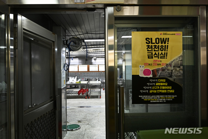 [경기=뉴시스] 김종택 기자 = 전국학교비정규직연대회의가 임금 차별 해소와 노동 환경 개선을 요구하며 총파업에 돌입한 31일 경기도 한 초등학교 급식조리실이 텅 비어 있다. 2023.03.31. [email protected]