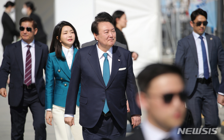 [통영=뉴시스] 홍효식 기자 = 윤석열 대통령과 부인 김건희 여사가 31일 경남 통영 영운항에서 열린 제12회 수산인의날 기념식에 입장하고 있다. 2023.03.31. [email protected]