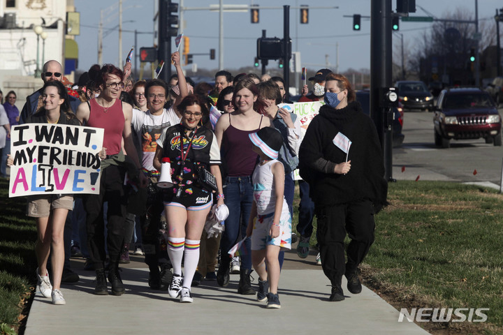 [토피카=AP/뉴시스] 지난달 31일(현지시간) 미 캔자스주 토피카에서 대부분 트랜스젠더인 '국제 트랜스젠더 가시화의 날'을 맞아 캔자스주 의회 청사 주변을 행진하고 있다. 미국 내 공화당 세력이 강한 주에서 최근 트랜스젠더를 규제하는 법안이 봇물 터지듯 나오고 있어 성소수자(LGBTQ+) 커뮤니티의 거센 반발을 사고 있다. 31일은 트랜스젠더의 다양한 삶을 드러내고 차별에 반대하기 위해 만들어진 제15회 ‘국제 트랜스젠더 가시화의 날’이다. 2023.04.01.
