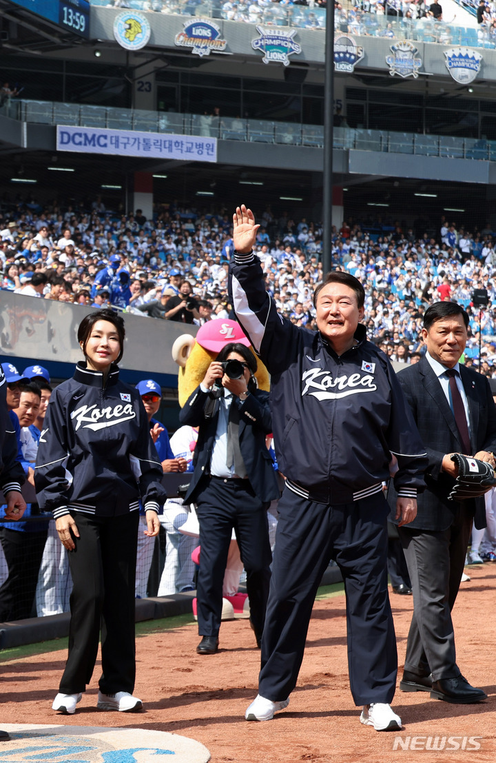 [대구=뉴시스] 전신 기자 = 윤석열 대통령이 1일 대구 삼성라이온즈파크에서 열린 프로야구 NC 다이노스와 삼성 라이온즈 개막전에서 시구에 앞서 관중들을 향해 인사하고 있다. (대통령실통신사진기자단) 2023.04.01. [email protected]