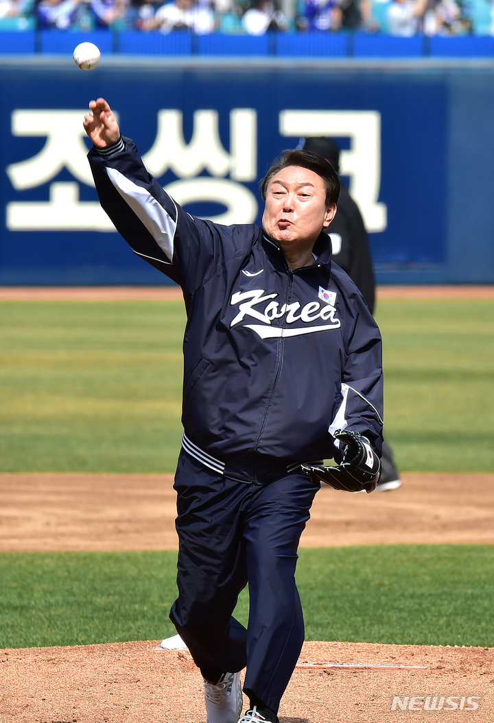 [대구=뉴시스] 이무열 기자 = 윤석열 대통령이 1일 오후 대구 수성구 삼성라이온즈파크에서 열린 2023 신한은행 SOL KBO리그 삼성 라이온즈와 NC 다이노스의 개막전 경기에서 시구하고 있다. 2023.04.01. [email protected]