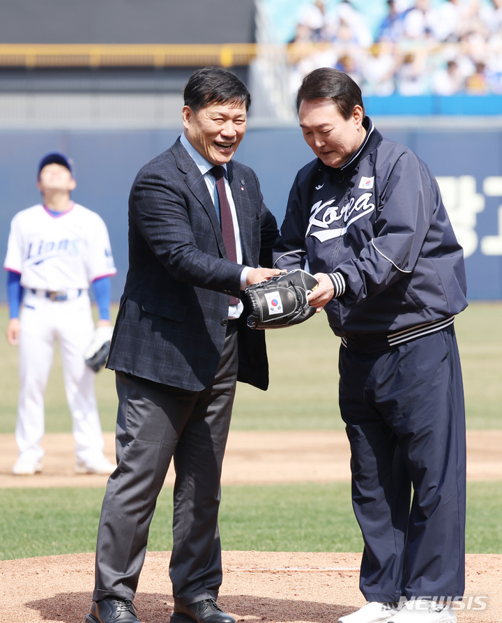[대구=뉴시스] 전신 기자 = 윤석열 대통령이 1일 대구 삼성라이온즈파크에서 열린 프로야구 NC 다이노스와 삼성 라이온즈 개막전에서 허구연 한국야구위원회 총재로부터 시구공을 받고 있다. (대통령실통신사진기자단) 2023.04.01. [email protected]
