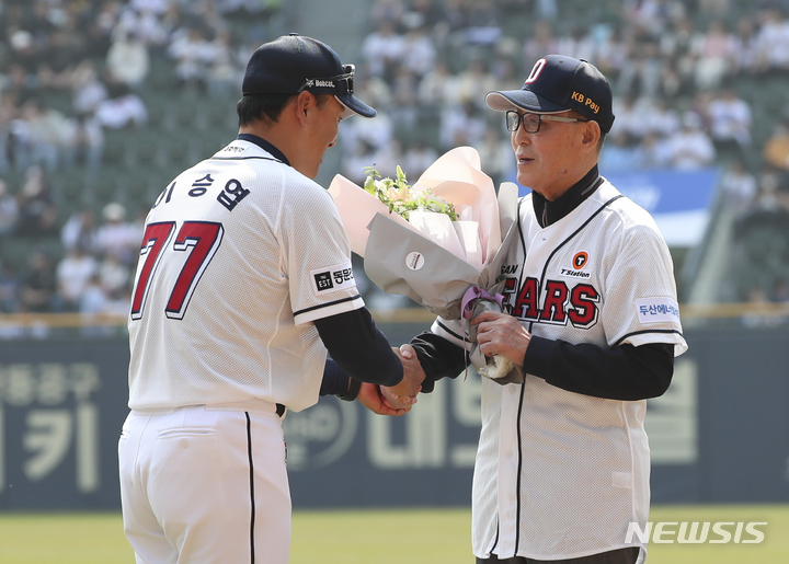 [서울=뉴시스] 김근수 기자 = 1일 오후 서울 송파구 잠실야구장에서 열린 2023 프로야구 개막전 두산 베어스 대 롯데 자이언츠의 경기 시작 전 이승엽 두산 감독이 김인식 전 국가대표팀 감독이 인사를 나누고 있다. 2023.04.01. [email protected]