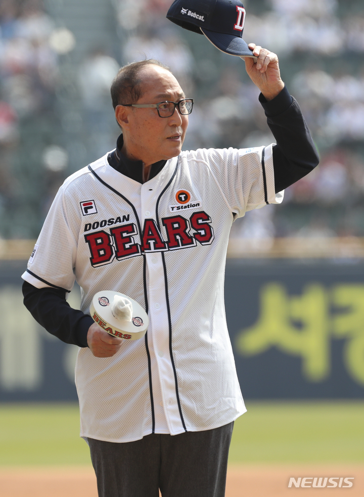 [서울=뉴시스] 김근수 기자 = 1일 오후 서울 송파구 잠실야구장에서 열린 2023 프로야구 개막전 두산 베어스 대 롯데 자이언츠의 경기 시작 전, 김인식 전 국가대표팀 감독이 팬들에게 인사를 하고 있다. 2023.04.01. [email protected]