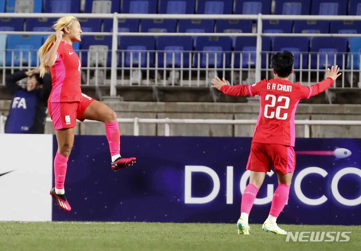 [수원=뉴시스] 정병혁 기자 = 7일 경기 수원월드컵 경기장에서 열린 여자축구 한국 대 잠비아의 친선경기, 대한민국 조소현이 골을 넣은 뒤 기뻐하고 있다. 2023.04.07. [email protected]