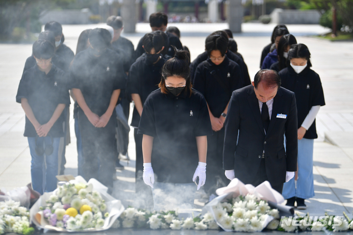 [광주=뉴시스] 이영주 기자 = 5·18민주화운동 43주기를 일주일 앞둔 11일 오전 광주 북구 운정동 국립5·18민주묘지에서 전북 임실 청웅중학교 학생들이 추념탑에 헌화·분향한 뒤 묵념하고 있다. 2023.05.11. [email protected]