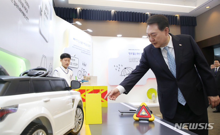 [서울=뉴시스] 홍효식 기자 = 윤석열 대통령이 12일 서울 강남구 코엑스에서 열린 제58회 발명의 날 기념식에 앞서 청소년 발명 전시회장을 찾아 '2차 사고방지를 위한 접이식 휴대용 바리케이드 캐리어'를 관람하고 있다. 2023.05.12. [email protected]
