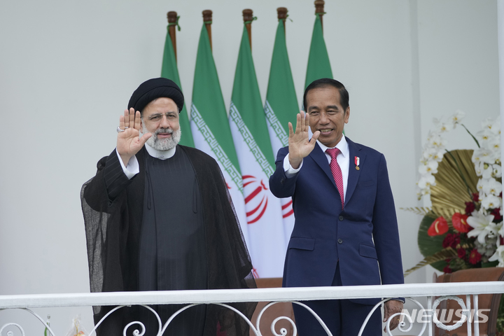 [보고르=AP/뉴시스] 에브라힘 라이시(왼쪽) 이란 대통령이 23일(현지시각) 인도네시아 서자바 보고르의 대통령궁에서 조코 위도도 인도네시아 대통령과 회담 전 취재진을 향해 손을 흔들고 있다. 라이시 대통령은 조코위 대통령과 인도네시아·이란 특혜무역협정(PTA)을 체결하는 것으로 알려졌다. 2023.05.23.