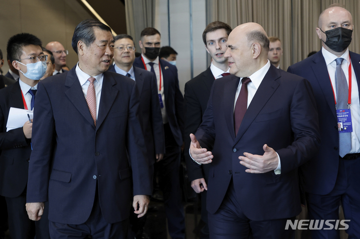 [상하이=AP/뉴시스] 미하일 미슈스틴(오른쪽) 러시아 총리가 23일(현지시각) 중국 상하이에서 열린 러시아-중국 비즈니스포럼에 참석해 허리펑 중국 부총리와 얘기를 나누며 행사장으로 향하고 있다. 2023.05.23.